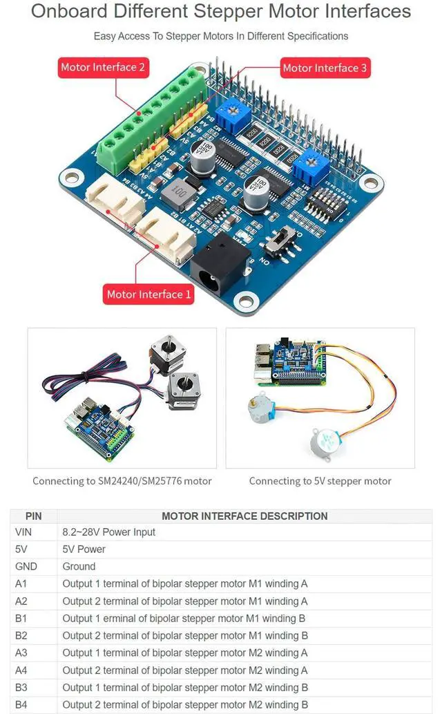 OverviewStandard Raspberry Pi 40PIN GPIO extension header, supports Raspberry Pi series boards, Jetson NanoOnboard dual HR8825 motor controller IC with built-in microstepping indexer, drives two stepper motors, easy to use6 available microstepping modes, configured with the