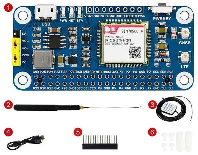 Common baudrate auto-negotiation: 9600/19200/38400/57600/115200 bps Comes with development resources and manual (examples for Raspberry Pi/Arduino/STM32)PACKAGE CONTENT1. SIM7080G Cat-M/NB-IoT HAT x12. LTE antenna x13. GPS External Antenna (B) x14. USB type A plug to micro plug cable x15. 220PIN female header x16. RPi screws pack (2pcs) x1