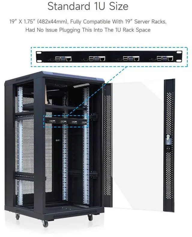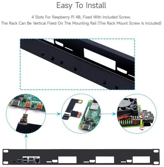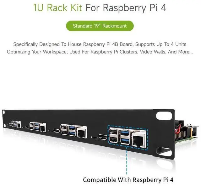 Specifically Designed To House Raspberry Pi 4B Board, Supports Up To 4 Units ^^ Optimizing Your Workspace, Used For Raspberry Pi Clusters, Video Walls, And More... ^^ 19 X 1.75 (482x44mm), Fully Compatible With 19 Server Racks, Had No Issue Plugging This Into The 1U Rack Space ^^ 4 Slots For Raspberry Pi 4B, Fixed With Included Screw; ^^ The Rack Can Be Vertical Fixed On The Mounting Rail (The Rack Mount Screw Is Included)