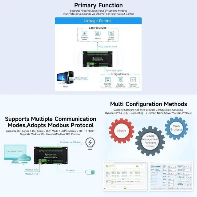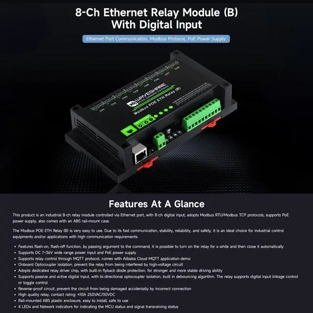 Features flash-on, flash-off function, by passing argument to the command, it is possible to turn on the relay for a while and then close it automatically. Supports DC 7~36V wide range power input and PoE power supply ^^ Supports relay control through MQTT protocol, comes with Alibaba Cloud MQTT application demo. Onboard Optocoupler isolation, prevent the relay from being interfered by high-voltage circuit ^^ Adopts dedicated relay driver chip, with built-in flyback diode protection, for stronger and more stable driving ability. Supports passive and active digital input, with bi-directional optocoupler isolation, built in debouncing algorithm.