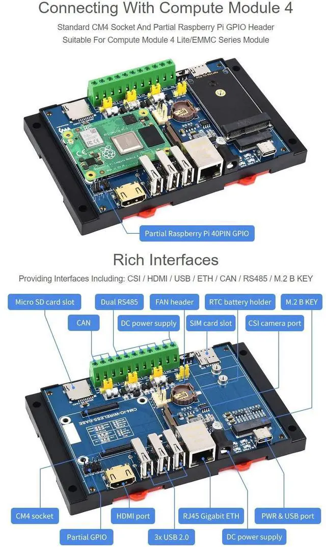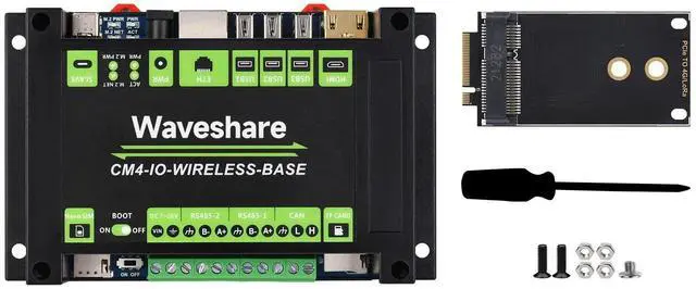Suitable For IoT Applications Like IoT Getaway, Wireless Router, Intelligent Data Acquisition... ^^ This is an industrial expansion module based on Raspberry Pi CM4, which features common interfaces such as Gigabit Ethernet, HDMI, USB, and GPIO, allows additional 4G / 5G / LoRa wireless communication modules to be connected via the M. 2 or Mini-PCIe socket. ^^ There are also industrial interfaces/resources including RS485, CAN, and RTC. ^^ Combined with the industrial rail-mount protection case, the module is an ideal choice for building IoT gateway, 4G/5G router, IoT data acquisition, or even the PLC device in industrial automatic control system, and more.