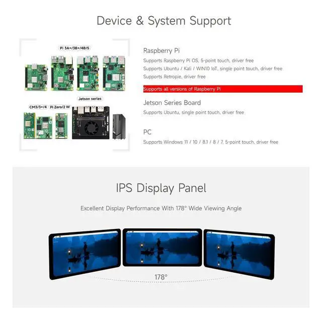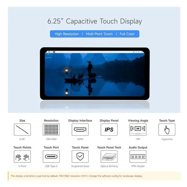 The display orientation is portrait by default, 7201560 resolution (HV). Change the software config for landscape display. ^^ Supports Raspberry Pi 5/4B/A+/B+/2B/3B/3B+/Zero W/Zero WH ^^ Compatible with Supports Windows 11/10/ 8.1 /8 /7 ^^ Excellent Display Performance With 178 Wide Viewing Angle ^^ Up to 5-Point touch, depending on the operating system, up to 6H hardness toughened glass panel, optical Bonding, display well and dustproof