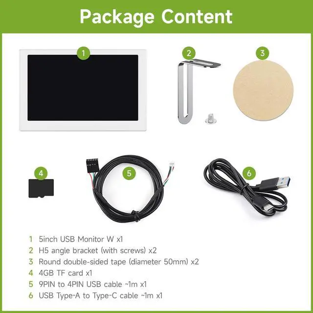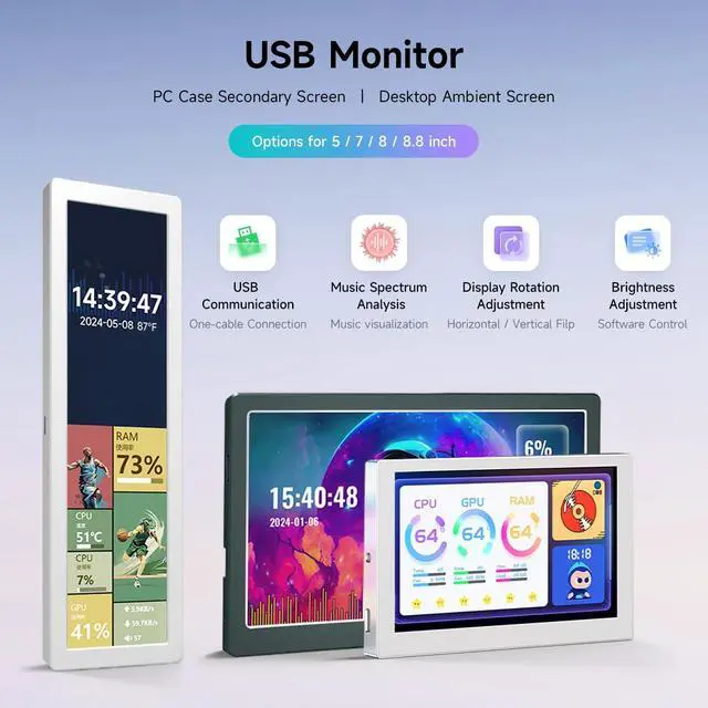 [E-User Manual]Provide electronic user manual, please refer to the user manual (PDF file) on the product details page. ^^ [One Cable Connection]Type-C one-cable connection, no complicated wiring, without occupying graphics card resources ^^ [Dynamic Theme Editor]Provides Waveshare self-developed software, easy to use, supports visual editing and real-time preview ^^ [Music Spectrum Theme]Supports using custom audio file or audio capture with onboard microphone ^^ [Various Data Monitoring]Real time display multiple monitoring data. Such as CPU/ Graphics card/ Memory/ Hard disk drive/ Network/ others(Board model/ city/ weather/ date time/ volume)