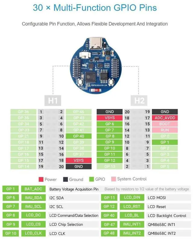 Its various low-power operating modes cater to power consumption needs in IoT, mobile devices, wearable electronics, smart homes, and other application scenarios. Parameters LCD Parameter Display Chip---GC9A01A Resolution---240 (H) RGB x 240 (V) Display Panel---IPS Display Interface---SPI Display Size--- 32.4 mm Pixels--- 0.135H x 0.135V mm IMU Paramters Sensor Name---QMI8658 Accelerator Resolution: 16-bit
