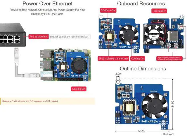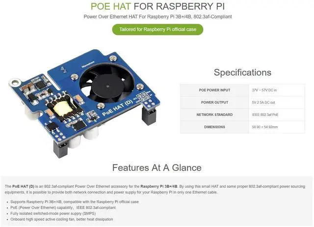 Supports Raspberry Pi 3B+/4B, compatible with the Raspberry Pi official case ^^ PoE (Power Over Ethernet) capabilityIEEE 802.3 af-compliant ^^ Fully isolated switched-mode power supply (SMPS) ^^ Onboard high speed active cooling fan, better heat dissipation ^^ It is possible to provide both network connection and power supply for your Raspberry Pi in only one Ethernet cable.