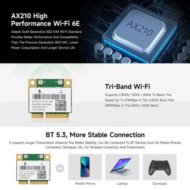 ^^ Tri-Band Connectivity: Equipped with tri-band support ( 2.4GH z, 5GHz, and 6GHz), the AX210 ensures excellent performance in high-traffic environments and offers a seamless wireless experience.