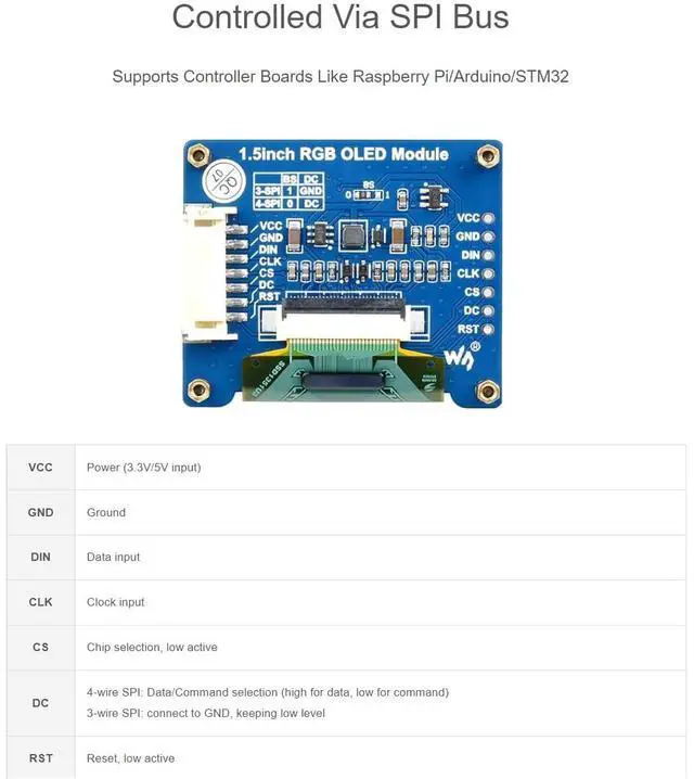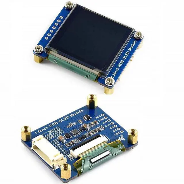 1.5 inch RGB OLED display module, 128x128 pixels, 16-bit high color, SPI interfaceOverviewThis is a general RGB OLED display Module, 1.5 inch diagonal, 128x128 pixels, 16-bit high color (65K colors), with embedded controller, communicating via SPI interface.
