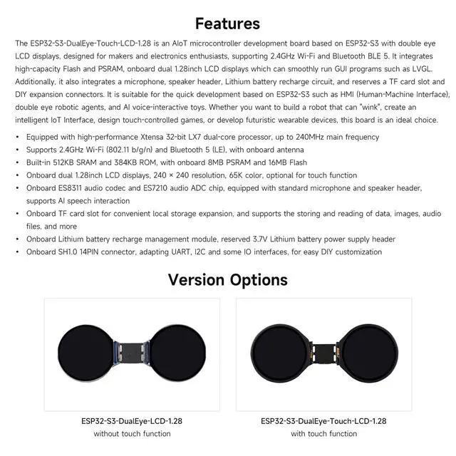 LCD Displays: Equipped with dual 1.28 -inch LCD displays featuring 240240 resolution and 65K colors, perfect for creating interactive GUIs, touch-controlled interfaces, and more. Touch functionality is optional for enhanced user experience.