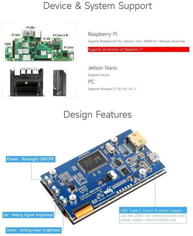 The display orientation is portrait by default, 480800 resolution (HV). Change the software config for landscape display. ^^ Supports all versions of Raspberry Pi. Supports Raspberry Pi OS / Ubuntu / Kali / WIN10 IoT / Retropie, driver free ^^ Supports Windows 11 / 10 / 8.1 / 8 / 7. Supports Ubuntu ^^ Excellent display performance with 170 wide viewing angle ^^ Provide Online User Manual, please check the manual carefully before using.