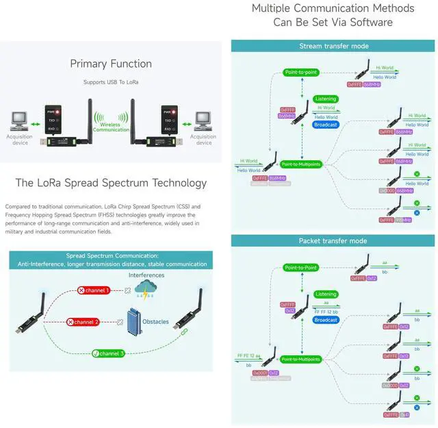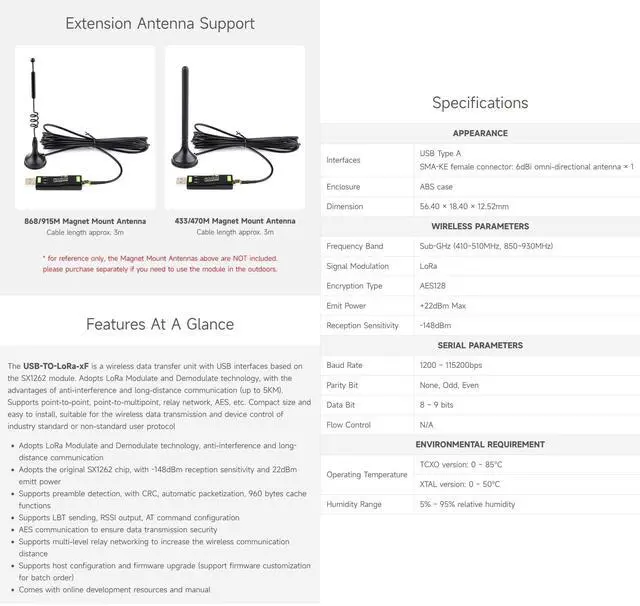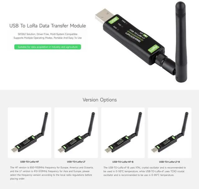 This is 2 PCS Version. USB-TO-LoRa-xF uses TCXO crystal oscillator and is recommended to be use in 0~85 temperature. ^^ Adopts the original SX1262 chip, with -148dBm reception sensitivity and 22dBm emitt power ^^ AES communication to ensure data transmission security. Supports multi-level relay networking to increase the wireless communication distance ^^ Supports preamble detection, with CRC, automatic packetization, 960 bytes cache functions. Supports LBT sending, RSSI output, AT command configuration ^^ Supports host configuration and firmware upgrade (support firmware customization for batch order). Comes with online development resources and manual.