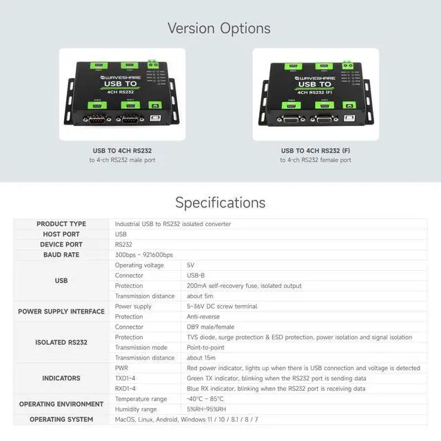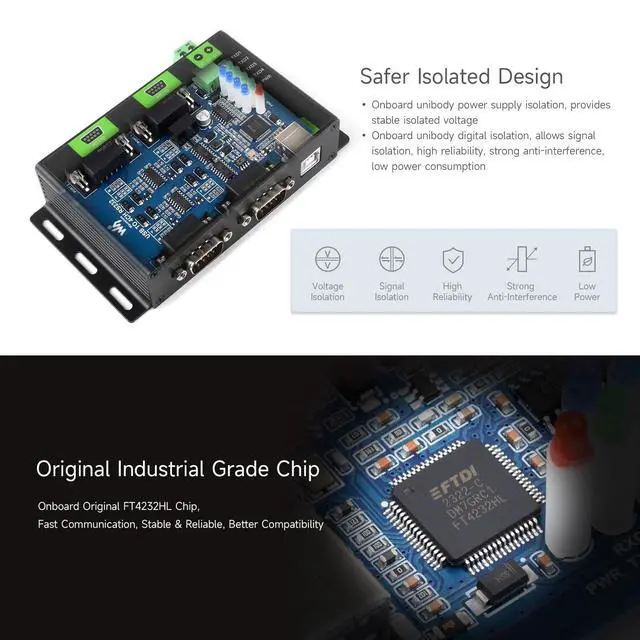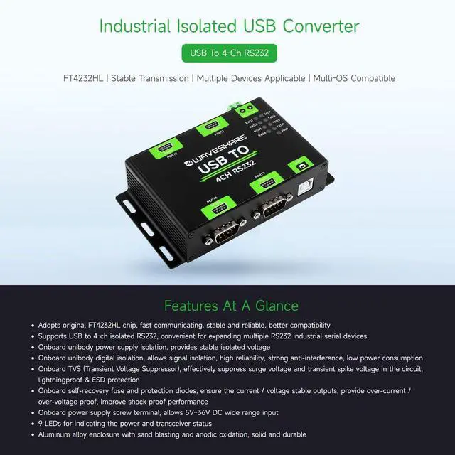 Adopting original FT4232HL chip, RS232 adopts DB9 female interface, high-speed communication, stable, reliable and good compatibility. 4 isolated RS232 interfaces can be extended via USB, which is convenient for users to extend access to multiple RS232 industrial serial devices. Compatible with Mac/Linux/Android/Windows 11/10/ 8.1 /8/7 and other systems ^^ On-board integrated power isolation, can provide stable isolation voltage. On-board integrated digital isolation provides signal isolation with high reliability, strong anti-interference and low power consumption ^^ On-board TVS (transient voltage suppression tube), can effectively suppress the surge voltage and transient spike voltage in the circuit, anti-static.