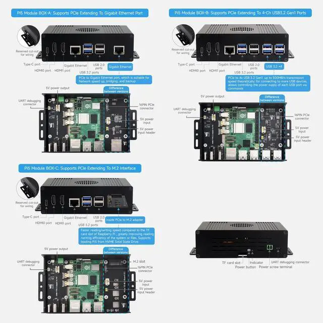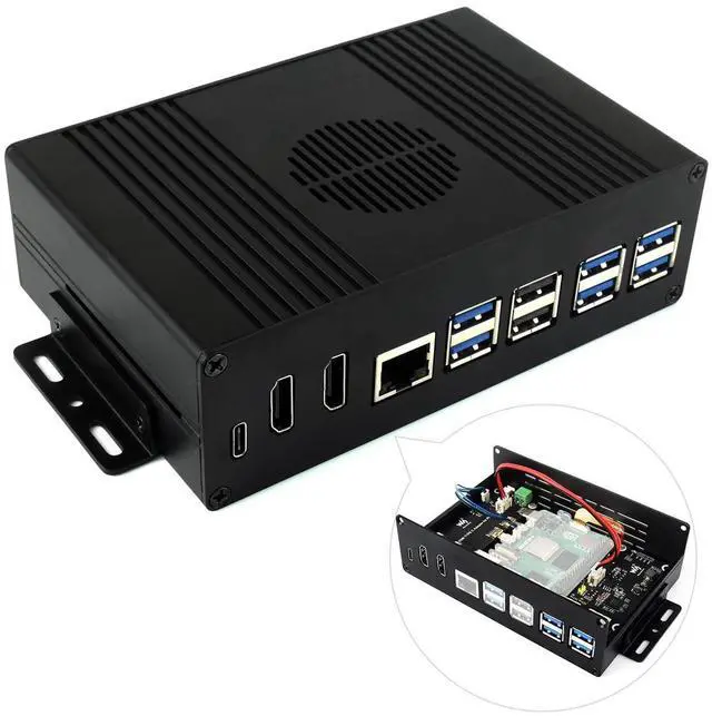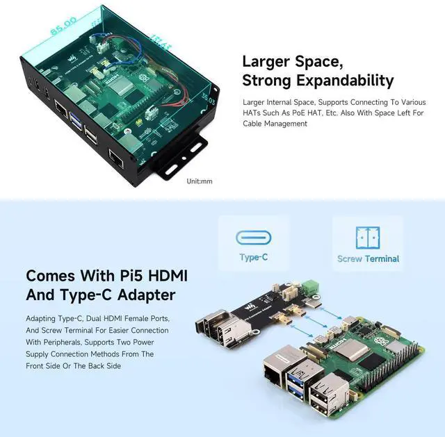 The Raspberry Pi 5 is NOT included, please purchase separately if needed. ^^ Supports PCIe Extending To 4-Ch USB 3.2 Gen1 Ports ^^ Larger internal space, supports connecting to various HATs such as PoE HAT, Etc. Also with space left for cable management ^^ Adapting Type-C, dual HDMI female ports, and screw terminal for easier connection with peripherals, supports two power supply connection methods from the front side or the back side ^^ Rich WiKi Resources We provide official Wiki resources, please contact us for more information.