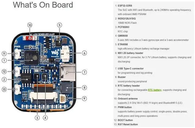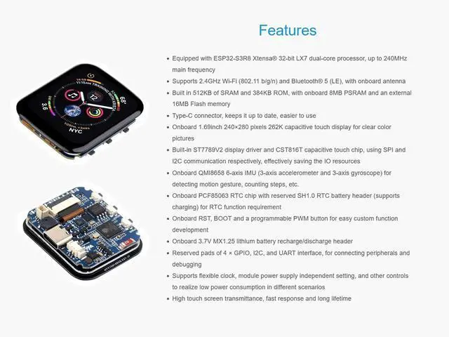 OverviewESP32-S3-Touch-LCD- 1.69 is a low-cost, high-performance MCU board, tiny size, with onboard 1.69 inch LCD display, Lithium battery recharge manager, 6-axis sensor (3-axis accelerometer and 3-axis gyroscope), RTC, and so on, which makes it easy for you to develop and integrate it into products quickly. FeaturesEquipped with ESP32-S3R8 32-bit LX7 dual-core processor, up to 240MHz main frequencySupports 2.4GH z Wi-Fi ( 802.11 b/g/n) and Bluetooth 5 (LE), with onboard antennaBuilt in 512KB of SRAM and 384KB ROM, with onboard 8MB PSRAM and an external 16MB Flash memoryType-C connector, keeps it up to date, easier to useOnboard 1.69 inch 240280 pixels 262K capacitive touch display for clear color picturesBuilt-in ST7789V2 display driver and CST816T capacitive touch chip, using SPI and I2C communication respectively, effectively saving the IO resourcesOnboard QMI8658 6-axis IMU (3-axis accelerometer and 3-axis gyroscope) for detecting motion gesture, counting steps, etc.
