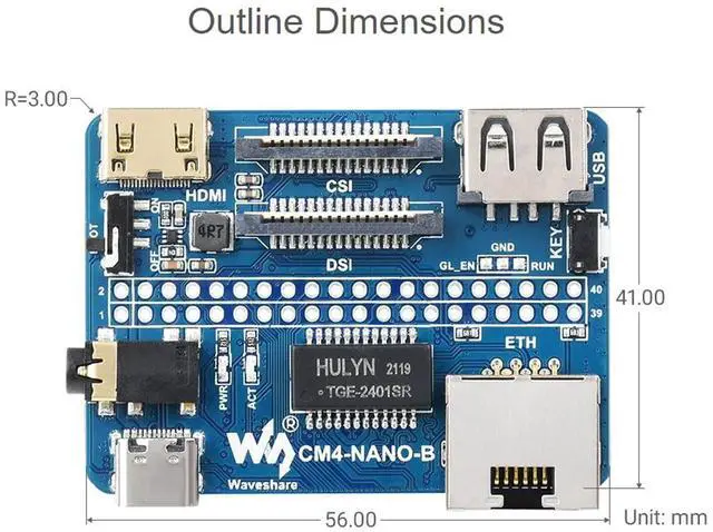 ^^ Compact Size: The board has a compact form factor of 56x41mm, matching the size of the CM4 module, making it perfect for integration into compact embedded systems or applications.