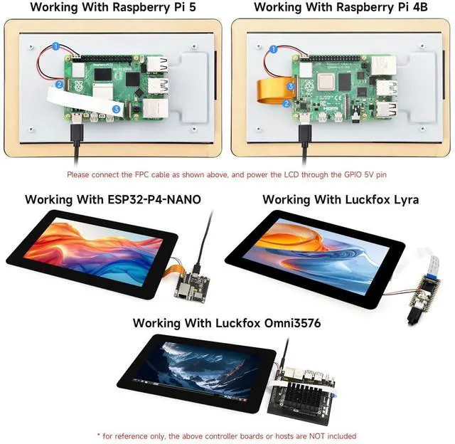 Supports Raspberry Pi OS, 10-point touch. Supports LVGL GUI programs, up to 10-point touch. Supports Buildroot / Ubuntu, etc. 10-point touch. Supports Buildroot / Debian / Ubuntu / Android, etc. 10-point touch ^^ The display orientation is portrait by default, with 7201280 resolution (HV). Change the software config for landscape display. ^^ Up to 10-point touch, depending on the operating system. Up to 6H hardness toughened glass panel. Optical bonding, provides clear image, dustproof. Adopts anti-fingerprint panel coating, easy to clean ^^ Integrates the driver circuit into an FPC cable, the total thickness of the LCD is only 9.3 mm ^^