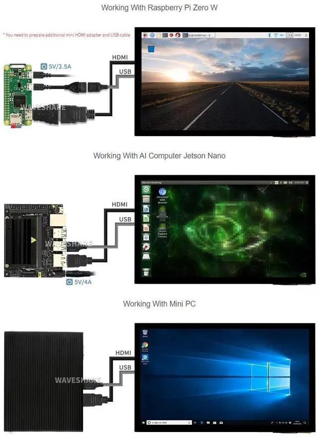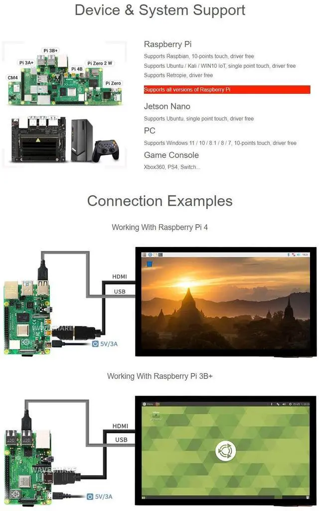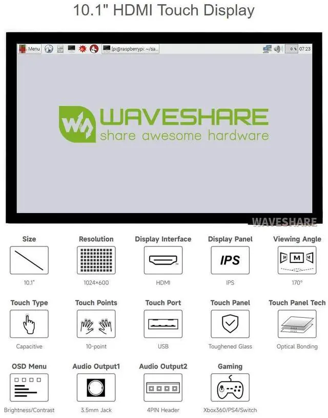 Hardware resolution: 1024600. Toughened glass panel features 6H hardness and 10-Points capacitive touch. ^^ Optical Bonding for better touching. When used with Raspberry Pi, it supports Raspberry Pi OS / Ubuntu / Kali and Retropie. ^^ When used as a computer monitor, it supports Windows 11/10/ 8.1 /8/7. Features 3.5 mm Headphone jack and 4PIN audio interface for HDMI audio. ^^ Supports common game consoles like XBOX360 and Switch. Backlight is controllable for power saving.