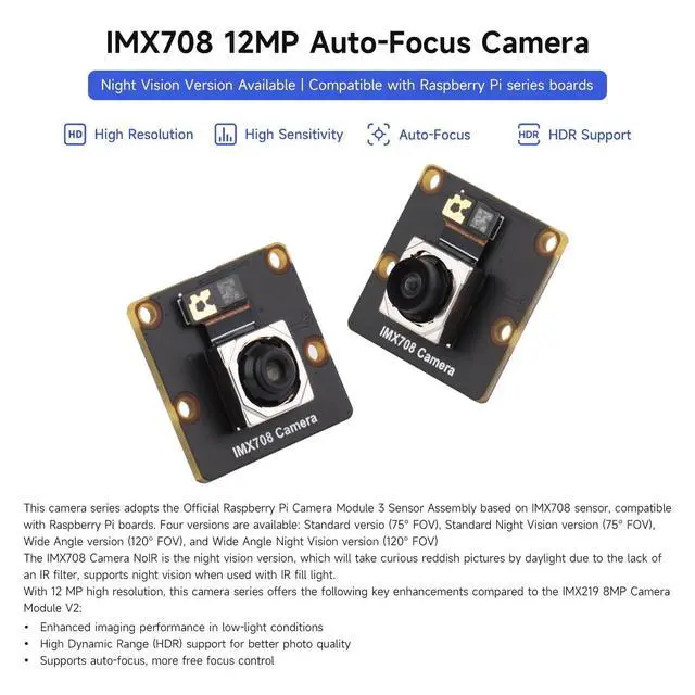 ^^ Advanced Features: The IMX708 Camera series includes High Dynamic Range (HDR) support, resulting in improved photo quality across varying light conditions. Additionally, it offers auto-focus capabilities, providing greater freedom and precision in focus control for your photography needs.
