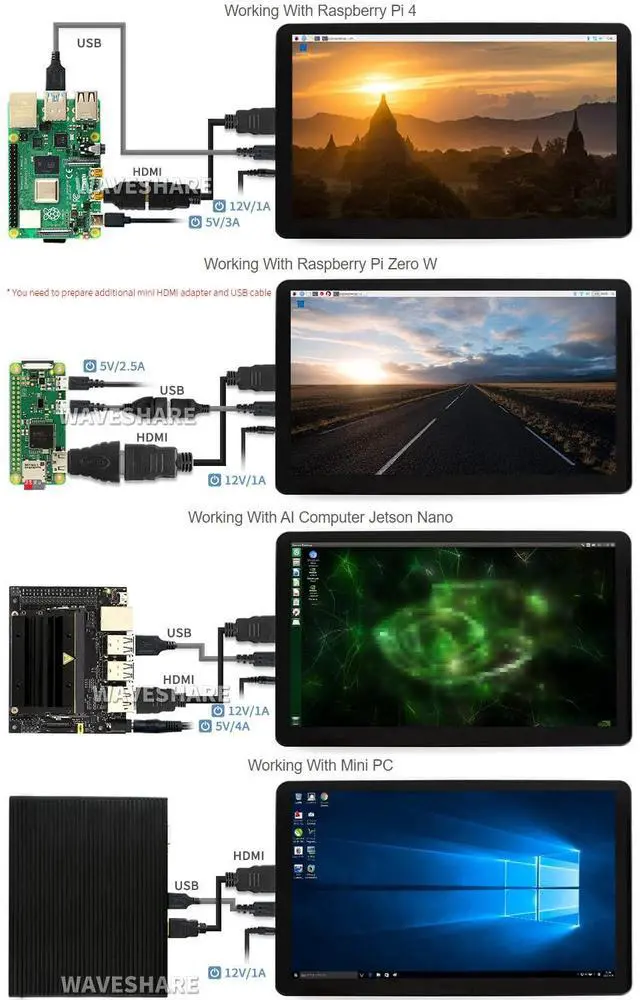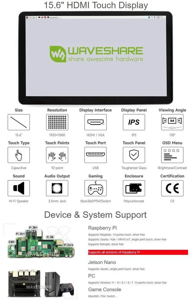 Provide online user manual, please check the manual carefully before using! ^^ 15.6 inch IPS screen, 1920x1080 high resolution. 3.5 mm audio jack, supports HDMI audio output ^^ Toughened glass capacitive touch panel, 6H hardness, 10-points capacitive touch control. ^^ When used with Raspberry Pi, supports Raspberry Pi OS / Ubuntu / Kali and Retropie. When used as a computer monitor, supports Windows 11/10/ 8.1 /8/7 ^^ Multi-languages OSD menu, for power management, brightness/contrast adjustment, etc. 3.5 mm audio jack, supports HDMI audio output