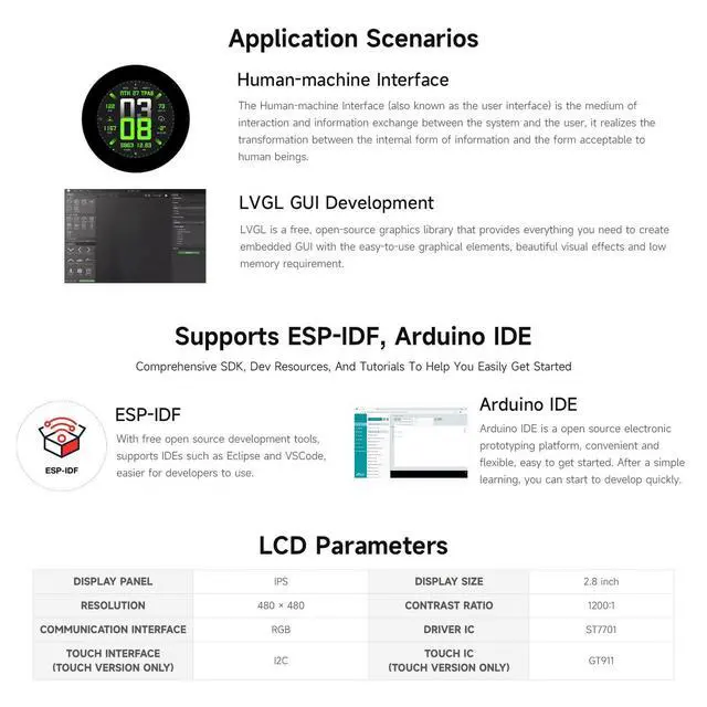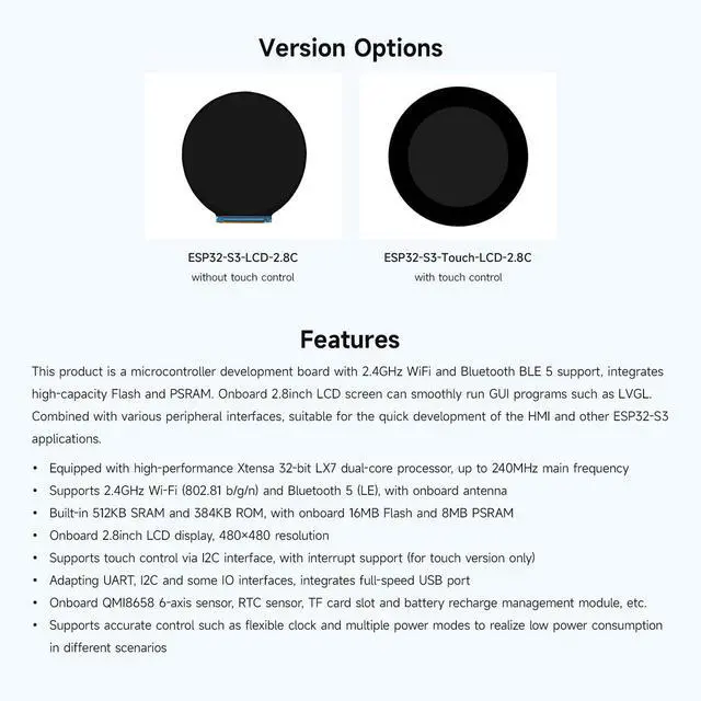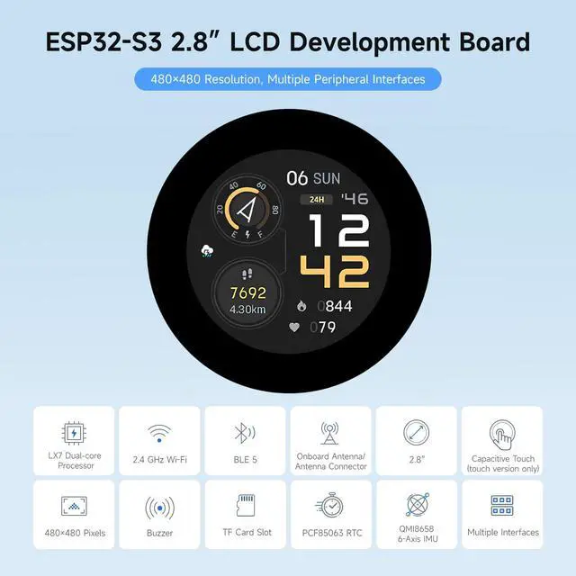 Onboard 2.8 inch LCD display, 480480 resolution ^^ Adapting UART, I2C and some IO interfaces, integrates full-speed USB port. Onboard QMI8658 6-axis sensor, RTC sensor, TF card slot and battery recharge management module, etc. ^^ Supports accurate control such as flexible clock and multiple power modes to realize low power consumption in different scenarios ^^