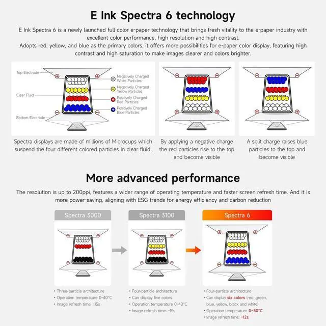Adopts E Ink Spectra 6 (E6) technology, featuring high contrast and high color saturation ^^ No backlight, keeps displaying last content for a long time even when power down ^^ Ultra low power consumption, basically power is only required for refreshing ^^