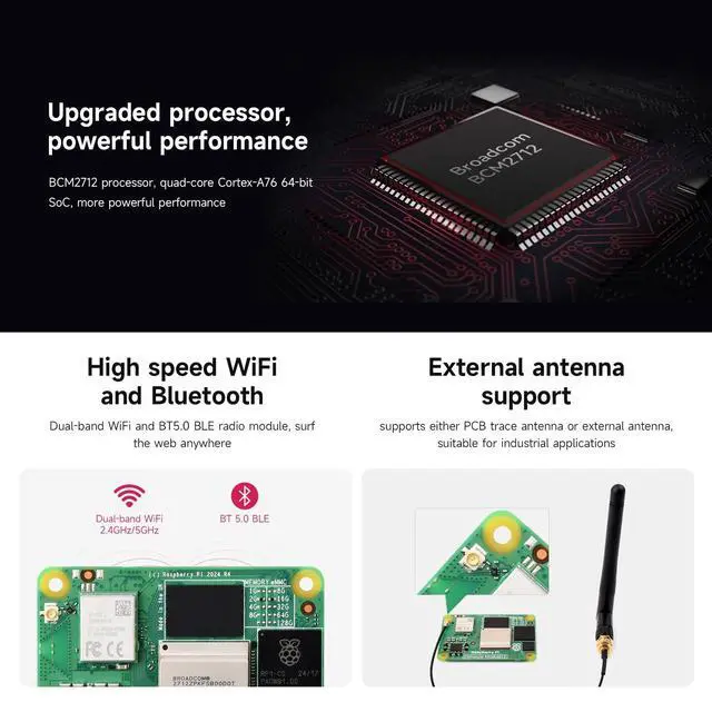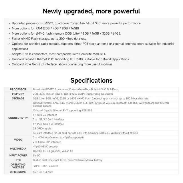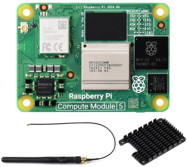 8GB RAM, 16GB eMMC Flash, with WIFI ^^ Raspberry Pi Compute Module 5 is a system on module (SoM) that delivers the power of Raspberry Pi 5 in a compact form factor, integrates a quad-core Arm Cortex-A76 processor, providing a variety of RAM and eMMC flash options, supports power circuitry and a rich set of interfaces. ^^ Compute Module 5 enables you to leverage Raspberry Pi 5's powerful hardware and optimised software stack in your own custom systems and form factors. ^^ Upgraded processor BCM2712, quad-core Cortex-A76 64-bit SoC, more powerful performance More options for RAM (2GB / 4GB / 8GB / 16GB) More options for eMMC Flash (0GB (Lite) / 8GB / 16GB / 32GB / 64GB) ^^ Faster eMMC Flash storage, up to 200 Mbps data rate Optional for certified radio module, supports either PCB trace antenna or external antenna, more suitable for industrial applications Adopts B to B connectors, most compatible with Compute Module 4 ^^ Onboard Gigabit Ethernet PHY supporting IEEE1588, suitable for network applications Onboard PCIe Gen 2 x1 interface, allows connecting more useful modules ^^