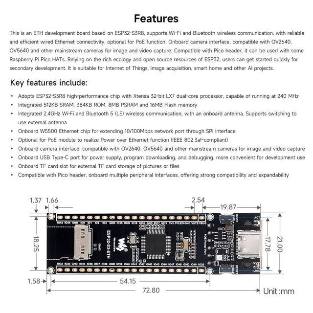 There are several options for this item, this option comes with a PoE module. For more package content details, please check the image 2 ^^ Adopts ESP32-S3R8 high-performance chip with Xtensa 32-bit LX7 dual-core processor, capable of running at 240 MHz. Integrated 512KB SRAM, 384KB ROM, 8MB PSRAM and 16MB Flash memory. Integrated 2.4GH z Wi-Fi and Bluetooth 5 (LE) wireless communication, with an onboard antenna. Supports switching to use external antenna ^^ Onboard W5500 Ethernet chip for extending 10/100Mbps network port through SPI interface. Optional for PoE module to realize Power over Ethernet function (IEEE 802.3 af-compliant) ^^ Onboard camera interface, compatible with OV2640, OV5640 and other mainstream cameras for image and video capture.