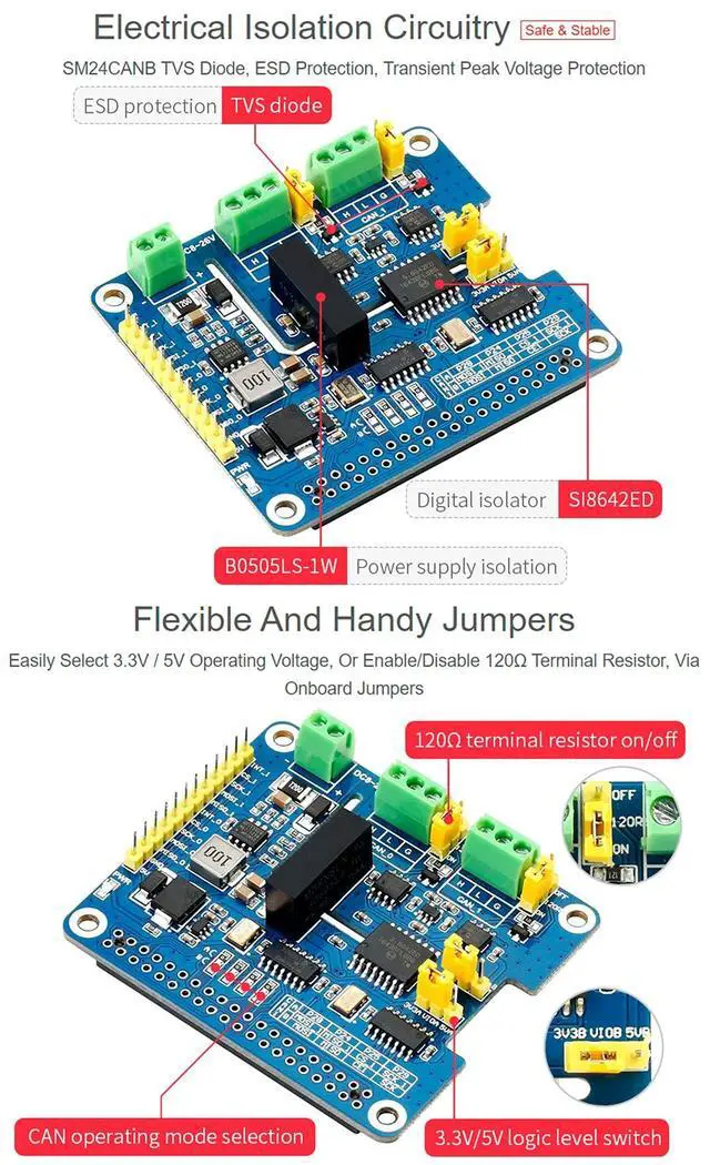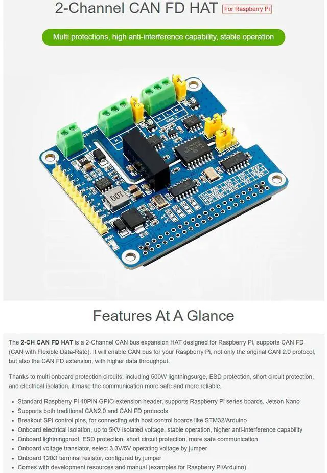 OverviewThis is a 2-Channel CAN bus expansion HAT designed for Raspberry Pi, supports CAN FD (CAN with Flexible Data-Rate), the speed is higher than the traditional 1Mbps of CAN 2.0, features multi onboard protection circuits, high anti-interference capability, and stable operation. It suits for fields such as automotive devices or industrial automation. Onboard protection circuits, including 500W lightningsurge, ESD protection, short circuit protection, and electrical isolation, it make the communication more safe and more reliable. FeaturesStandard Raspberry Pi 40PIN GPIO extension header, supports Raspberry Pi series boards, Jetson NanoSupports both traditional CAN 2.0 and CAN FD protocolsBreakout SPI control pins, for connecting with host control boards like STM32/ArduinoOnboard electrical isolation, up to 5KV isolated voltage, stable operation, higher anti-interference capabilityOnboard lightningproof, ESD protection, short circuit protection, more safe communicationOnboard voltage translator, select 3.3V /5V operating voltage by jumperOnboard 120 terminal resistor, configured by jumperComes with development resources and manual (examples for
