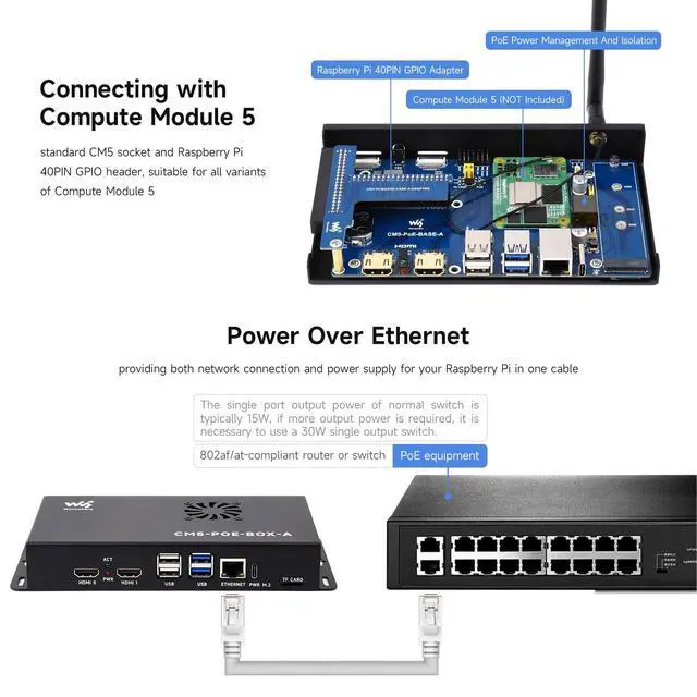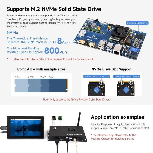 standard CM5 socket and Raspberry Pi 40PIN GPIO header suitable for all variants of Compute Module 5 ^^ Faster reading/writing speed compared to the TF card slot of Raspberry Pi, greatly improving reading/writing efficiency of the system or files, support booting Raspberry Pi from NVMe Solid State Drive ^^ Onboard connectors including MIPI / M. 2 / HDMI / USB / ETH / TF Card Slot ^^ Each cut-out is completely aligned with the connector ^^ Comes with cooling fan, combined with the airflow vent, better heat dissipation