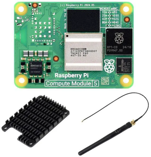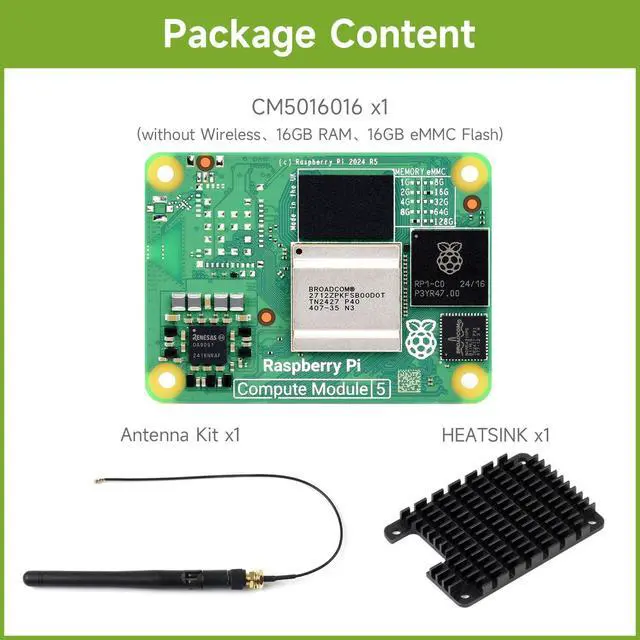 16GB RAM, 16GB eMMC Flash, without WIFI ^^ Raspberry Pi Compute Module 5 is a system on module (SoM) that delivers the power of Raspberry Pi 5 in a compact form factor, integrates a quad-core Arm Cortex-A76 processor, providing a variety of RAM and eMMC flash options, supports power circuitry and a rich set of interfaces. ^^ Compute Module 5 enables you to leverage Raspberry Pi 5's powerful hardware and optimised software stack in your own custom systems and form factors. ^^ Upgraded processor BCM2712, quad-core Cortex-A76 64-bit SoC, more powerful performance More options for RAM (2GB / 4GB / 8GB / 16GB) More options for eMMC Flash (0GB (Lite) / 8GB / 16GB / 32GB / 64GB) ^^ Faster eMMC Flash storage, up to 200 Mbps data rate Optional for certified radio module, supports either PCB trace antenna or external antenna, more suitable for industrial applications Adopts B to B connectors, most compatible with Compute Module 4 ^^ Onboard Gigabit Ethernet PHY supporting IEEE1588, suitable for network applications Onboard PCIe Gen 2 x1 interface, allows connecting more useful modules ^^
