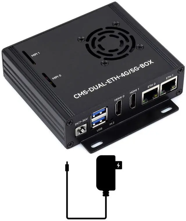 ^^ Power and Cooling: Supports a wide voltage range (7V~36V) via DC jack and a 5V 5A Type-C port. It also includes a 5V, 4PIN JST-SH PWM fan header for cooling solutions.