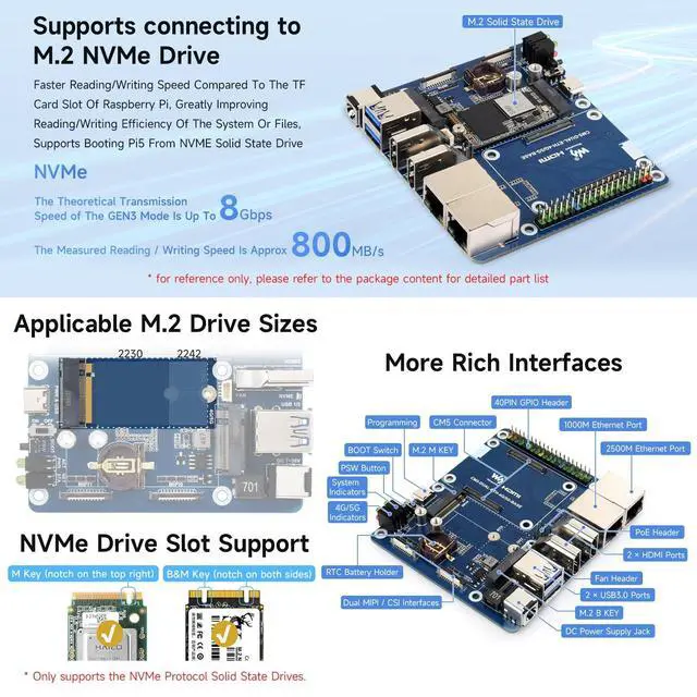 ^^ Video and Storage: Dual HDMI ports supporting 4K display outputs and a TF card socket for Compute Module 5 Lite variants (without eMMC). Also includes an M. 2 M KEY for PCIe and communication modules.