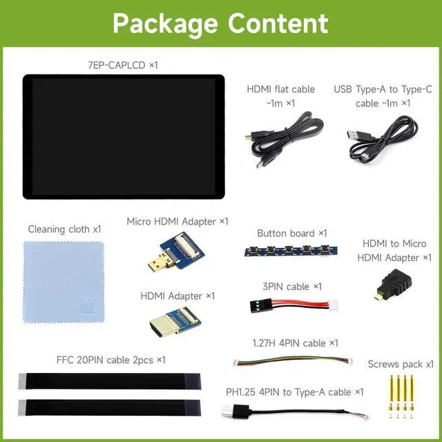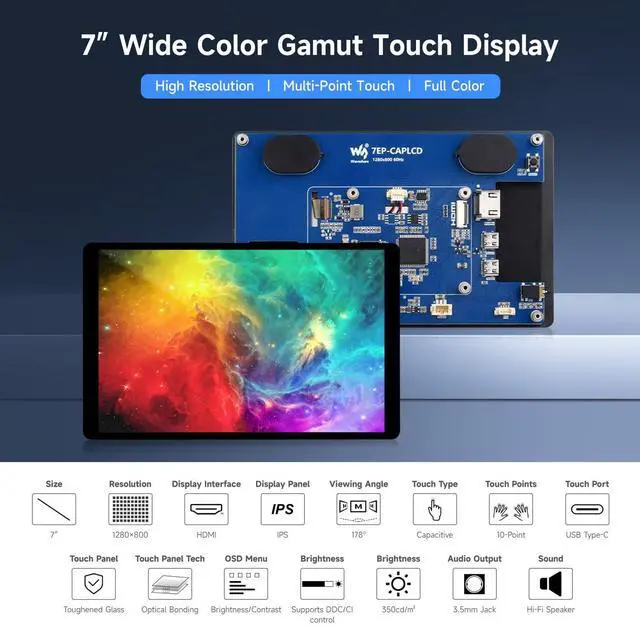 1280 800 resolution, provides clear image and vivid color display effect ^^ Excellent Display Performance With 178 Wide Viewing Angle ^^ Color Gamut Of This Display Is Up To NTSC 68%, Chroma Increases 58.3 %, Makes The Color More Pure, More Vivid ^^ up to 10-point touch, depending on the operating system up to 6H hardness toughened glass panel Optical Bonding, display well and dustproof ^^