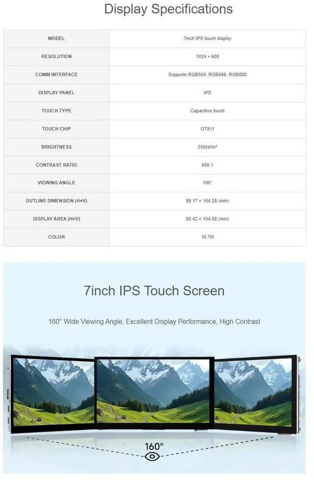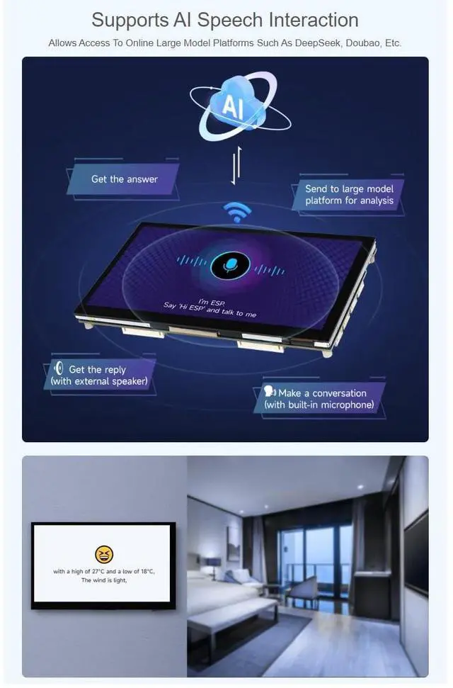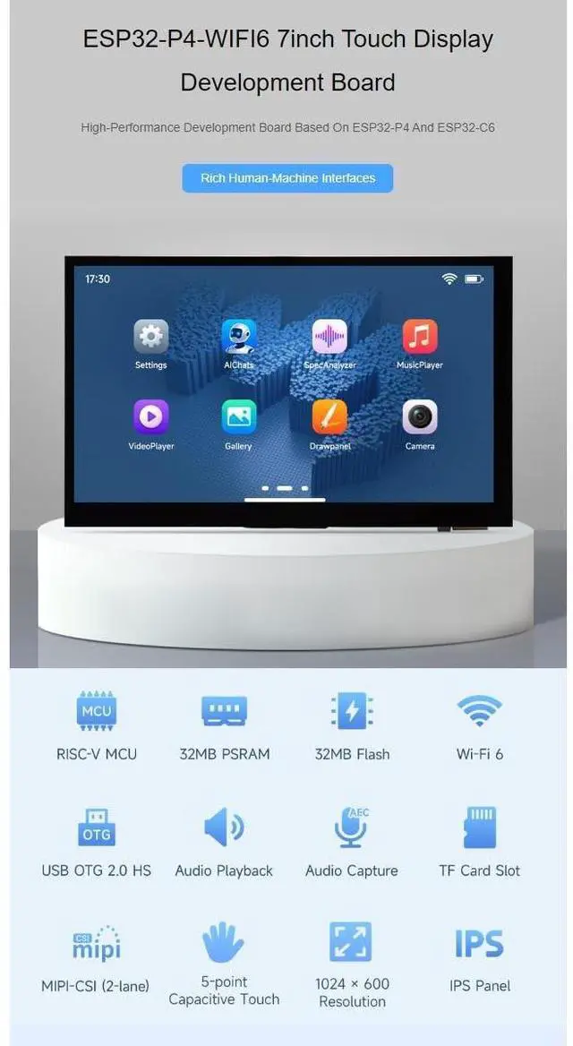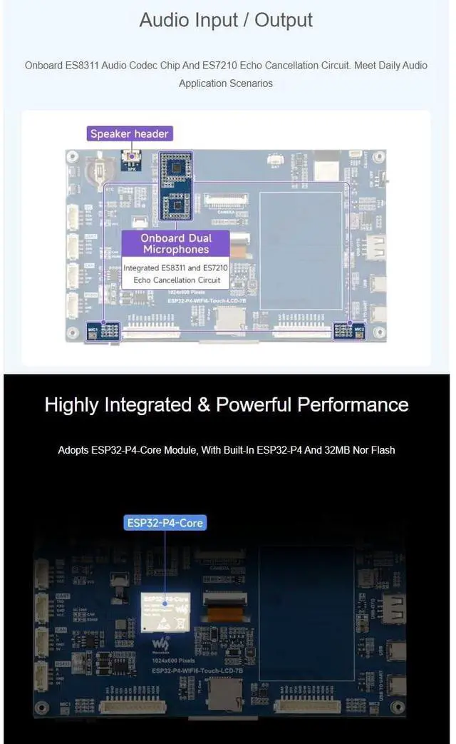 ESP32-P4-WIFI6 7inch Touch Display Development Board with OV5647 Camera. High-Performance Development Board Based On ESP32-P4 And ESP32-C6. Rich Human-Machine Interfaces ^^ 7inch IPS Touch Screen. 160 Wide Viewing Angle, Excellent Display Performance, High Contrast ^^ Capacitive 5-Point Touch. Supports 5-Point Sensitive Touch, Seamlessly Combining Intuitive Operation With Rapid Response For Efficient And Convenient Development ^^ Supports Expanding Multiple Peripherals. Supports The Expansion Of Multiple Peripherals Via CAN, RS485, UART And I2C Interfaces. Audio Input / Output. Onboard ES8311 Audio Codec Chip And ES7210 Echo Cancellation Circuit. Meet Daily Audio Application Scenarios ^^ Supports AI Speech Interaction.