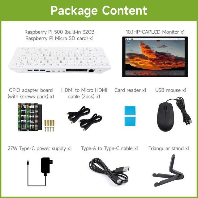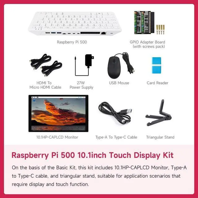 There are several options for this item, this option comes with 10.1 inch display. For more details, please check the 'package content' image. ^^ 10.1 inch Capacitive Touch Display, Wide Color Gamut, 1280800, Optical Bonding Toughened Glass Panel, HDMI/Type-C Display Interface, 10-Point Touch, Aluminum Alloy Case ^^ Raspberry Pi 500 features the same quad-core 64-bit Arm processor and RP1 I/O controller found in Raspberry Pi 5. With a one-piece aluminium heatsink built in for improved thermal performance, your Raspberry Pi 500 will run fast and smoothly even under heavy load, while delivering glorious dual 4K display outputs.