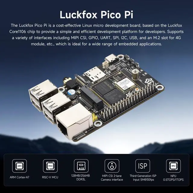 ^^ Cost-Effective and Efficient: The Luckfox Pico Pi offers an affordable Linux micro development board, powered by the Luckfox Core1106 chip, providing a simple platform for developers to create and test embedded applications.