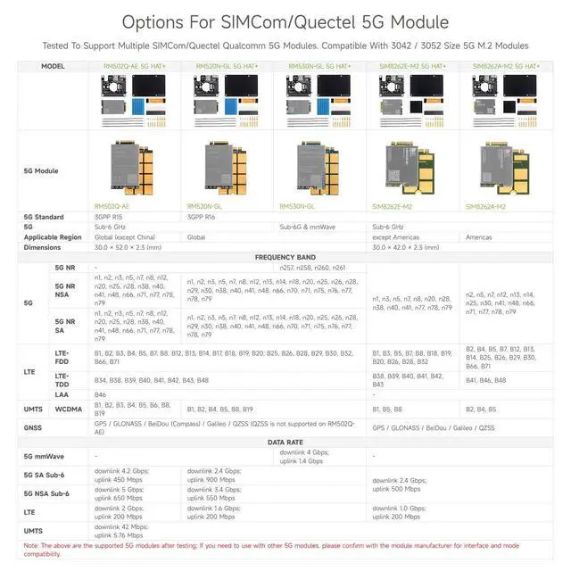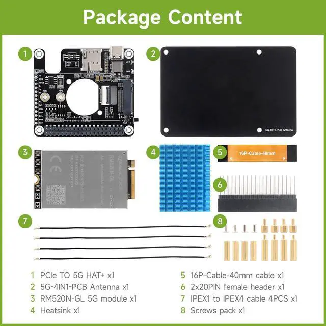 Provides 4 options for 5G module. This version comes with a RM520N-GL 5G module, 3GPP R16 5G Standard, global 5G module. ^^ Comes with PCIe TO 5G HAT+. Onboard M. 2 (NGFF) Key B slot, supports SIM82XX and RM5XX series 5G modules and is compatible with 3042/3052 packages. Onboard PCIE connector, can be directly connected to Raspberry Pi 5 PCIe interface for 5G networking, supports Raspberry Pi OS and OpenWRT ^^ Comes with PCIe TO 5G HAT+. HAT+ standard design with onboard I2C EEPROM, and supports Raspberry Pi 40PIN GPIO stackable expansion.