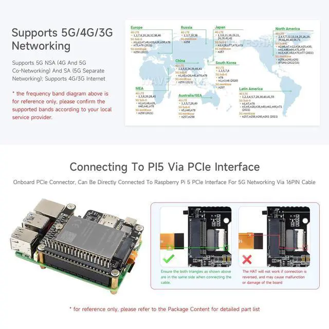 Onboard power monitoring chip for real-time measurement of voltage, current and power ^^ Comes with PCIe TO 5G HAT+. Onboard SIM card slot for NANO SIM card. Onboard Reset button, power and network indicators for easy debugging and monitoring the operating status ^^ Comes with customized 5G-4IN1-PCB Antenna for neat wiring management, supports top or bottom installation ^^ Images for reference only, the Raspberry Pi 5 is NOT included.