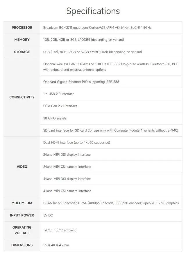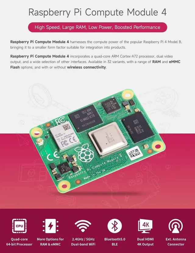 2GB RAM; 8 eMMC Flash; with WIFI module ^^ Upgraded processor BCM2711, quad-core Cortex-A72 (ARM v8) 64-bit SoC, more powerful performance ^^ More options for RAM (1GB/2GB/4GB/8GB), competent for large-scale data compilation ^^ Faster eMMC Flash storage, up to 100 MBytes/s data rate, which is four times faster than the CM3+ ^^ Option for fully certified radio module, the same one used on Pi4B, supports either PCB trace antenna or external antenna, more suitable for industrial applications