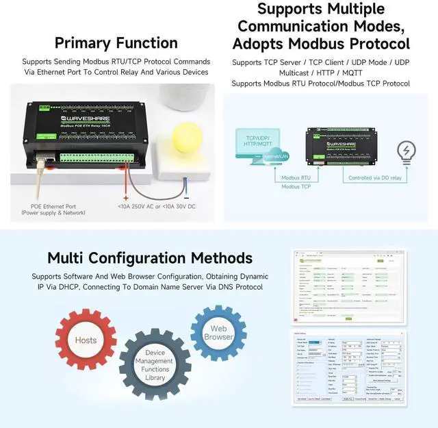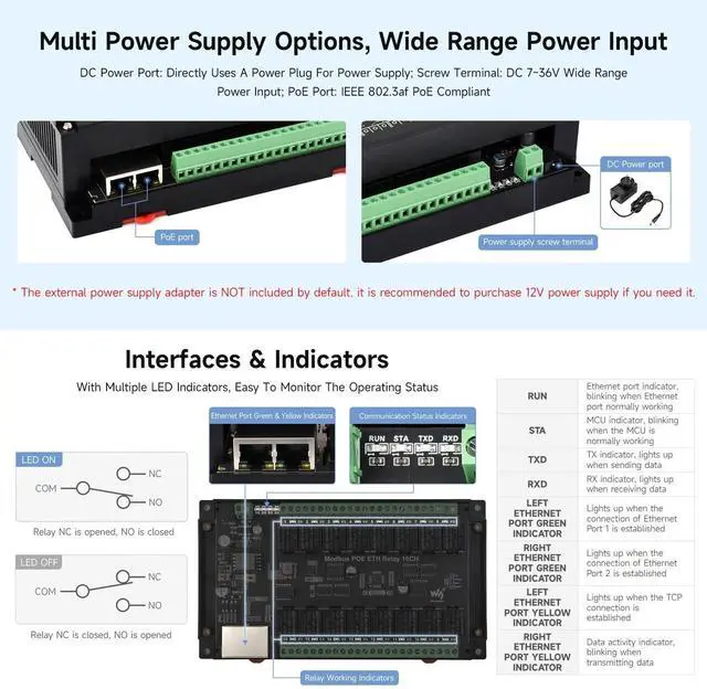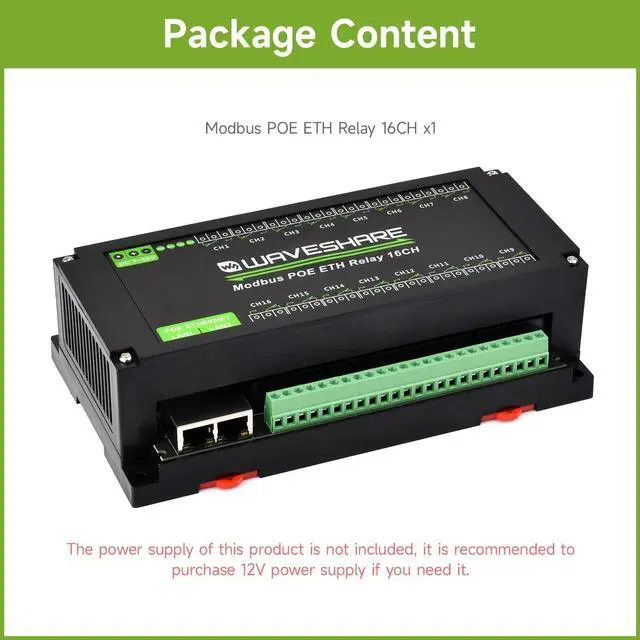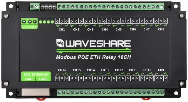 PoE Support: This 16-channel relay module is equipped with dual Ethernet ports, allowing for cascade communication via Ethernet ports, ensuring easy expansion and a reliable network connection. It also supports Power over Ethernet (PoE), eliminating the need for separate power cables and simplifying the overall system setup, ideal for environments with limited power outlets. ^^ Modbus RTU/TCP Protocol Compatibility & MQTT Support: Supporting both Modbus RTU and Modbus TCP protocols, the module offers flexible and industry-standard communication options. It is also compatible with the MQTT protocol for relay control, and comes with a demo application for Alibaba Cloud MQTT, making it simple to integrate the device into cloud-based industrial automation systems or IoT networks. ^^ Wide Power Input Range & Safety Features: The relay module supports a wide DC power input range of 7-36V, accommodating various power supply options in industrial settings. Additionally, it features onboard optocoupler isolation to protect the relays from high-voltage interference, ensuring reliable operation and preventing damage from electrical surges. ^^ Enhanced Relay Protection and