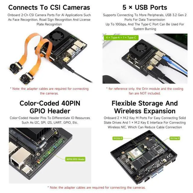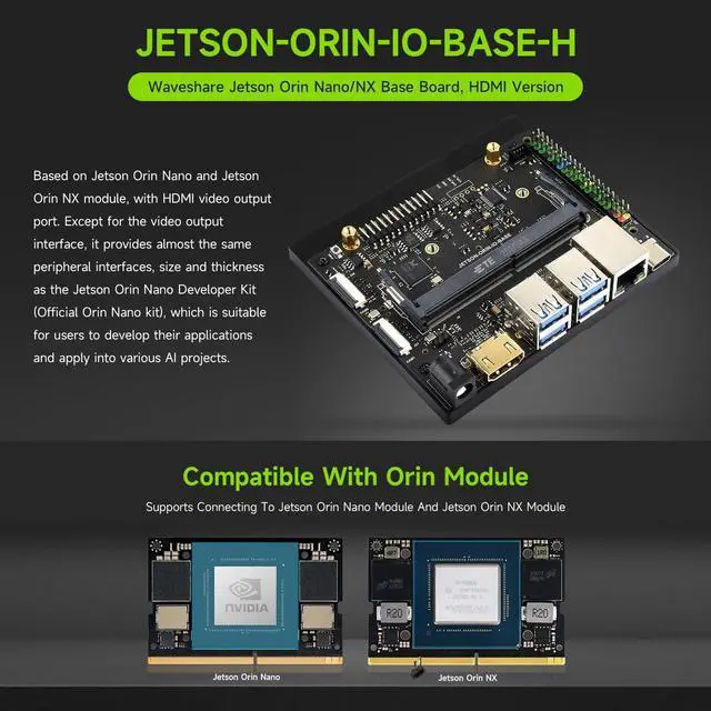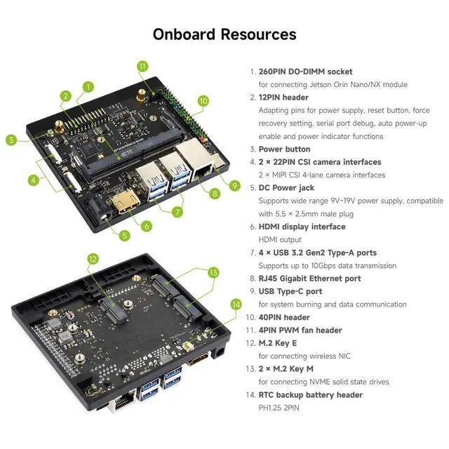 Based on Jetson Orin Nano and Jetson Orin NX module, with HDMI video output port. Except for the video output interface, it provides almost the same peripheral interfaces, size and thickness as the Jetson Orin Nano Developer Kit (Official Orin Nano kit), which is suitable for users to develop their applications and apply into various AI projects. ^^ Onboard 2-ch CSI camera ports for AI applications such as face recognition, road sign recognition and license plate recognition. ^^ Supports connecting to more peripherals, USB 3.2 Gen 2 ports for data transmission up to 10Gbps, and the Type-C port can be used for system burning.