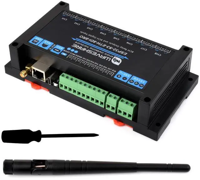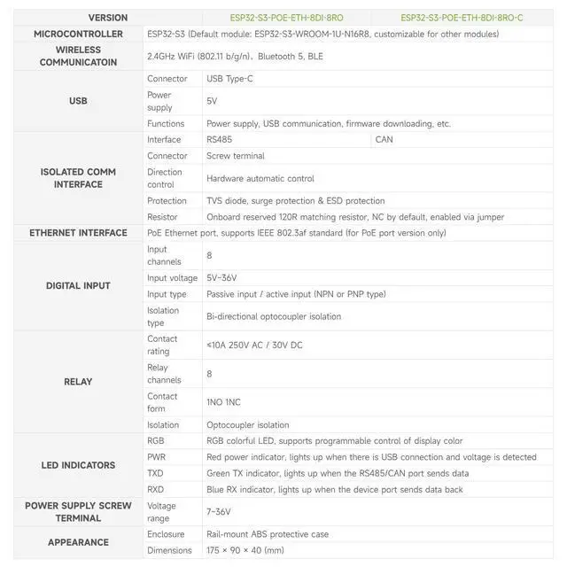 Power and Monitoring: Onboard USB Type-C for power, debugging, and firmware downloading, along with a wide 7~36V voltage input, RTC chip for scheduled tasks, and built-in indicators for monitoring device status.
