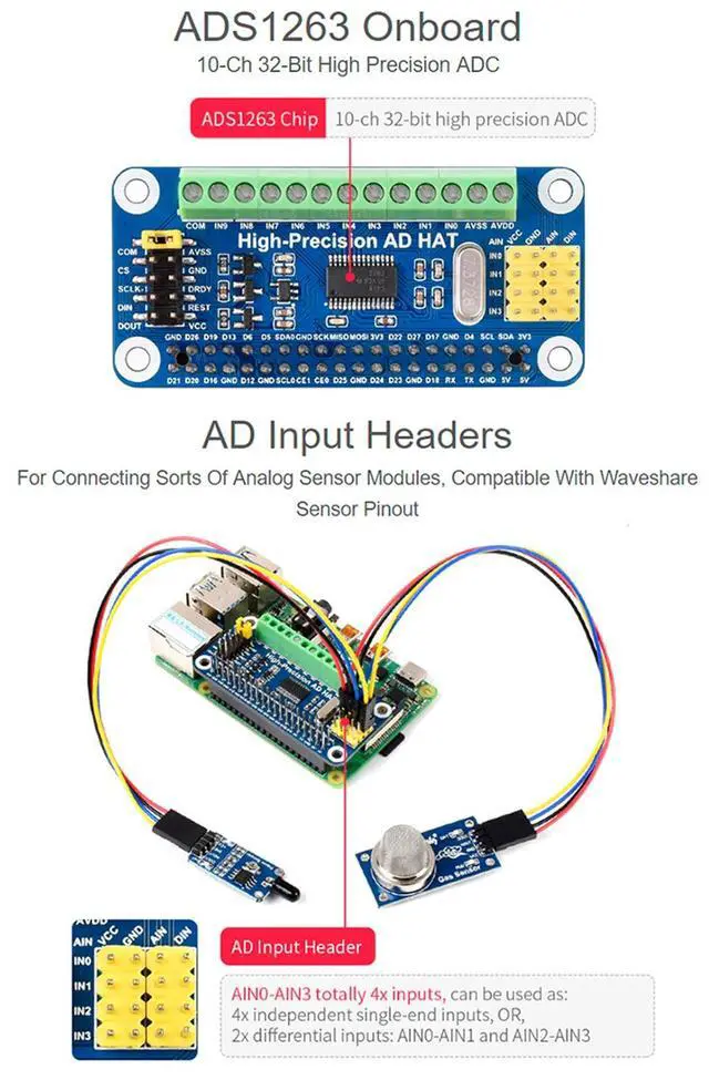 High-Precision AD HAT for Raspberry Pi, ADS1263 10-ch 32-bit ADC, compatible with Raspberry Pi series and Jetson NanoRaspberry Pi GPIO interface does not have AD function, if you want to use high-precision AD, Then i will be a good choiceFeaturesAdopts ADS1263 chip, low noise, low temperature drift, 10-ch 32-bit high precision ADC (5-ch differential input), 38.4 kSPS Max sampling ratewith embedded 24-bit auxiliary ADC, internal ADC test signal, IDAC, 2.5V internal reference voltage, 8x multiplexing GPIO, PGA (32 times Max) Onboard AD header input, compatible with Waveshare sensor pinout, for connecting sorts of sensor modulesOnboard AD screw terminal input, allows connecting analog signal and analog power supply, general purpose interfaceOnboard control header, make it easy to control the module by other hosts in additional to Raspberry PiThree-wire RTD (resistor temperature detector) circuit, enabled