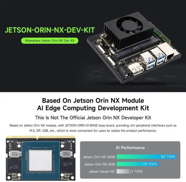 High-performance AI computing: The Jetson Orin NX AI development kit is based on the NV Orin NX module, offering up to 117/157 TOPS of AI performance, suitable for complex edge computing and embedded AI applications, with options for 8GB/16GB memory. ^^