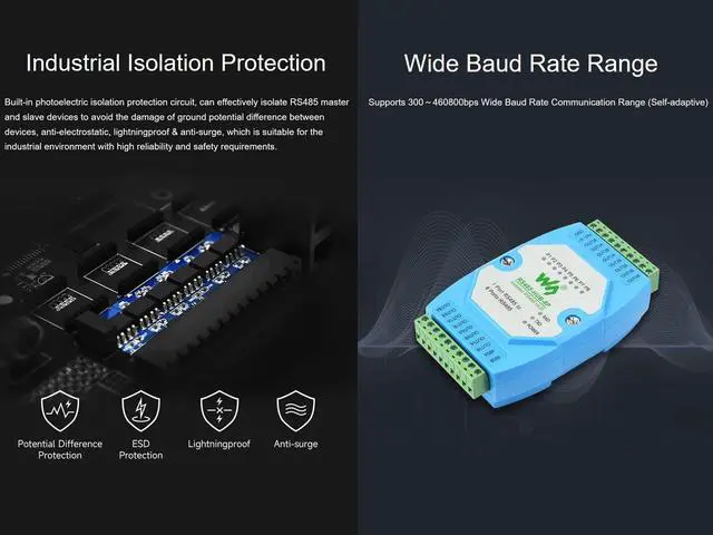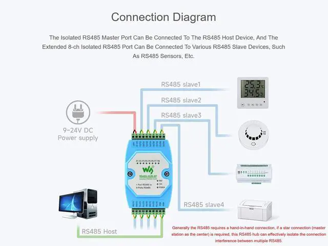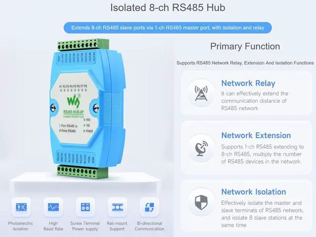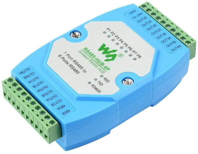 OverviewRS485-HUB-8P is an industrial grade isolated RS485 hub that can expand 8-ch RS485 slave ports through 1-ch RS485 master port and can realize relay, extension, and isolation functions of RS485 network, with screw terminal for power input. Rail-mount case design, easy to install, and cost-effective. It is suitable for applications like data acquisition, IoT gateway, safety & security IoT, and intelligent instrument monitoring... SpecificationInterface Standard---Compliant with RS485 StandardPhysical Interface---RS485 Screw TerminalBaudrate---300~460800bps (self-adaptive)Supported Nodes---Each RS485 port supports up to 32 nodesCommunication Distance---1200m (9600bps), the higher rate the shorter distanceOperating Method---RS485 two-wire (A, B), half-duplex transparent transmissionPower Supply---DC 9~24VOperating Temperature--- -45 ~ +85Environment Humidity--- <95%RHTransmission Medium---Normal parallel cables/twisted-pair cablesPackage ContentRS485-HUB-8P x1(The power supply of this product is not included, please purchase the power supply separately according to your need.