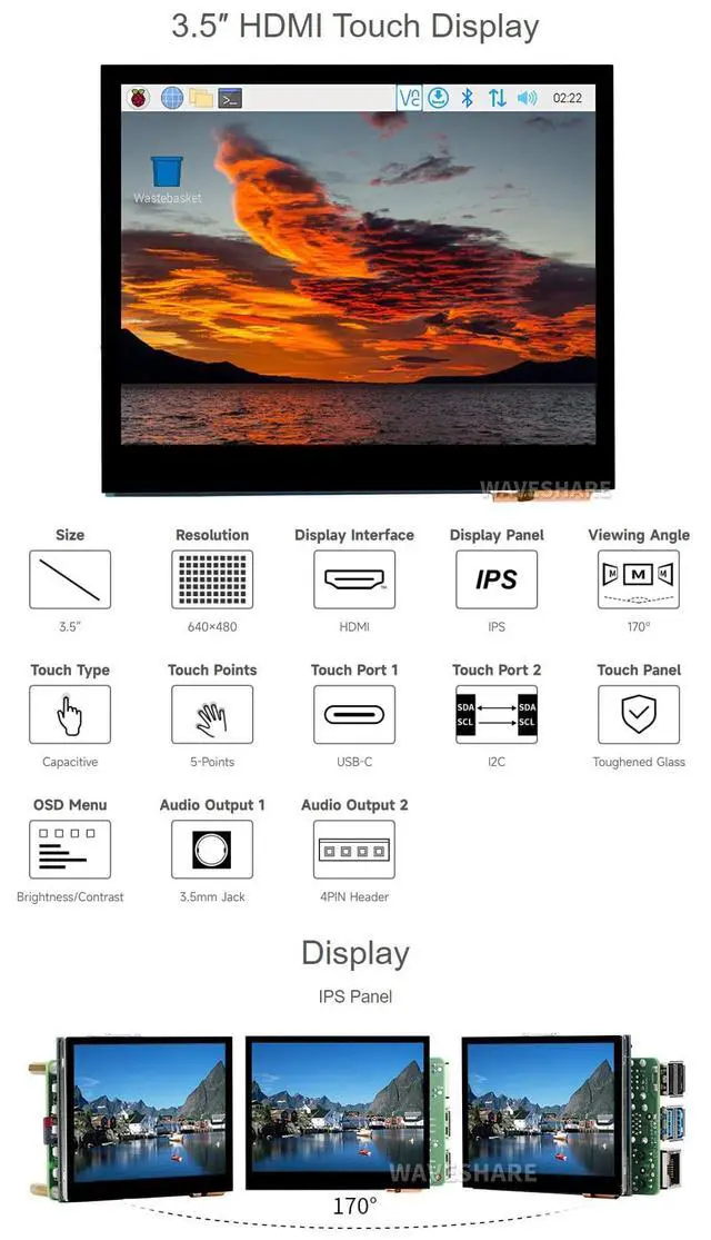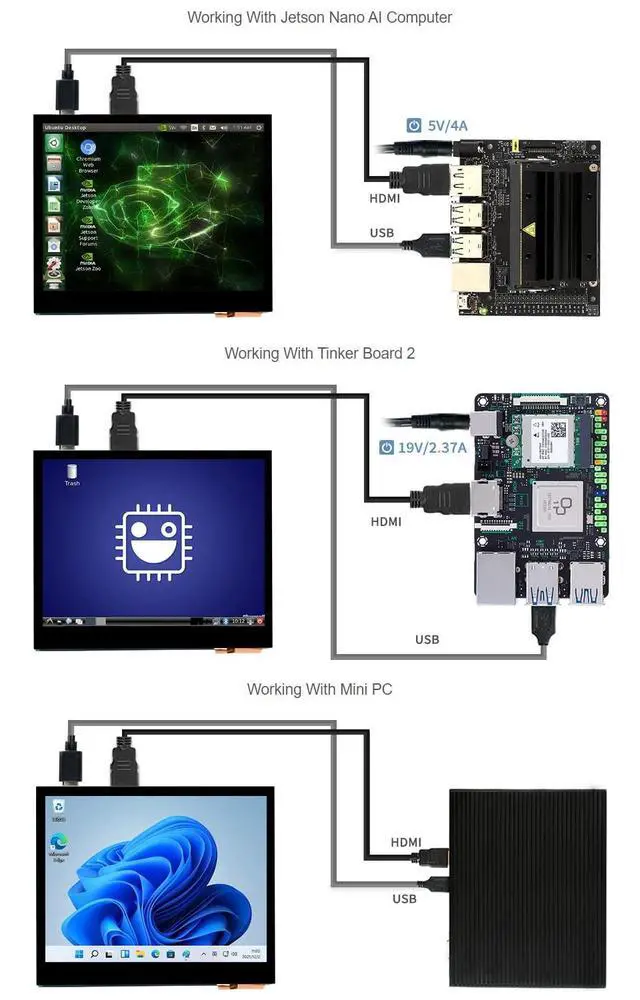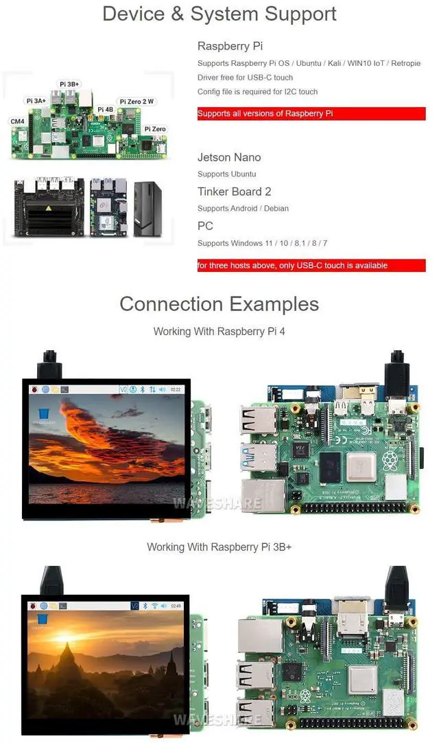 Working with Raspberry Pi, Supports Raspberry Pi OS / Ubuntu / Kali / WIN10 IoT / Retropie. Driver free for USB-C touch. Config file is required for I2C touch. ^^ Working with Jetson Nano, Supports Ubuntu. Working with Tinker Board 2, Supports Android / Debian. Working as Computer Monitor, Supports Windows 11/10/ 8.1 /8/7. ^^ For three hosts (Jetson Nano/Tinker Board 2/PC), only USB-C touch is available. ^^ Up to 5-points touch, depending on the operating system. Up to 6H hardness toughened glass panel.