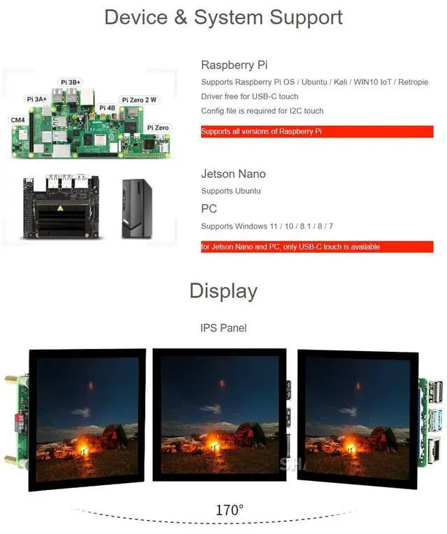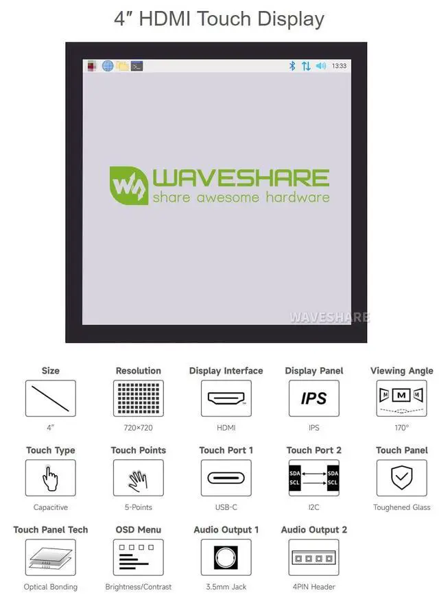 Provide online user manual, please check the manual carefully before using! ^^ Supports all versions of Raspberry Pi. For Jetson Nano and PC, only USB-C touch is available ^^ 4-inch IPS screen, hardware resolution is 720720. 5-point capacitive touch, tempered glass panel, hardness up to 6H. ^^ When used with Raspberry Pi, it supports Raspberry Pi OS / Ubuntu / Kali and Retropie. Ubuntu is supported when used with Jetson Nano. ^^ When used as a computer monitor, it supports Windows 11/10/ 8.1 /8/7. Onboard dual touch circuit, optional USB Type-C or I2C touch, it has more application scenarios.