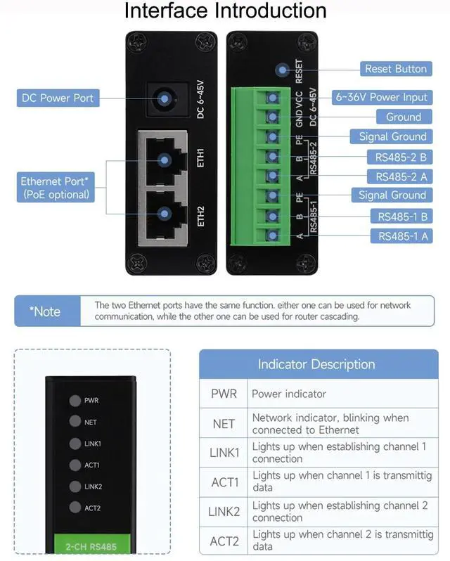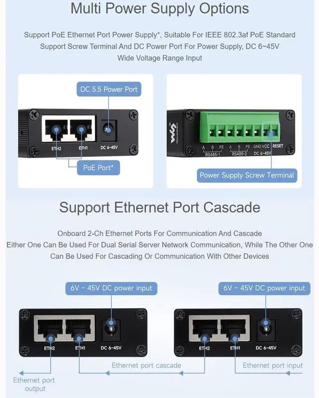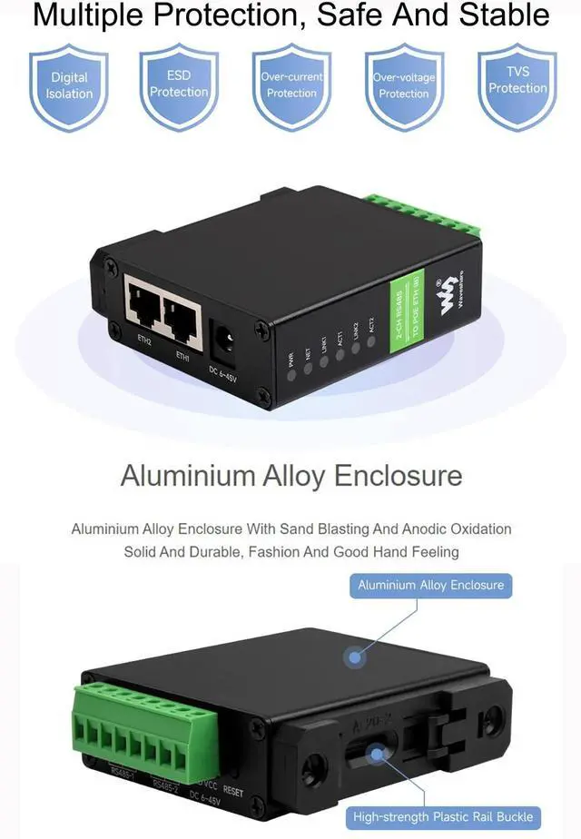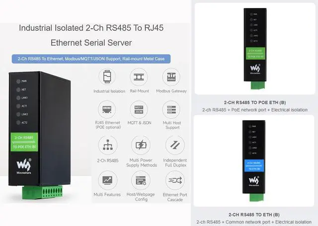 FeaturesThe module features dual RS485 and dual Ethernet ports with PoE function. designed for the industrial environment. Dual RS485 can work simultaneously without interfering with each other. It combines multi functions in one, including serial server, Modbus gateway, MQTT gateway, RS485 to JSON, and network switch. It is suitable for applications like data acquisition, IoT gateway, safety & security IoT, and intelligent instrument monitoring... Specifications1.