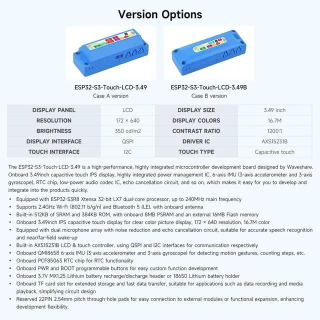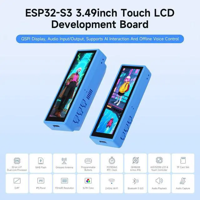 Comprehensive Development Platform: The ESP32-S3-Touch-LCD- 3.49 features a 3.49 -inch capacitive touch IPS display, integrated 6-axis IMU, RTC chip, and low-power audio codec, providing everything for rapid product development.