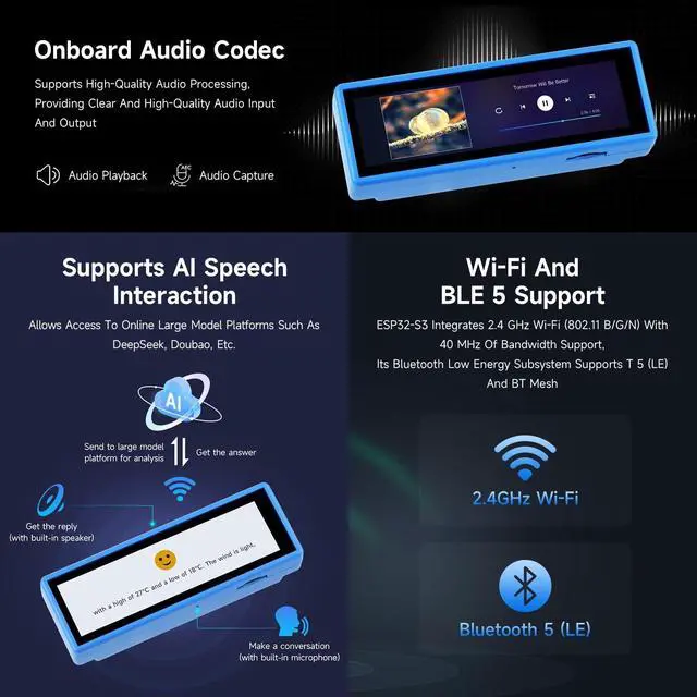 Advanced Audio & Motion Sensing: Features a dual-microphone array with noise reduction and echo cancellation for precise voice recognition and a 6-axis IMU for gesture tracking and motion analysis. ^^ Versatile