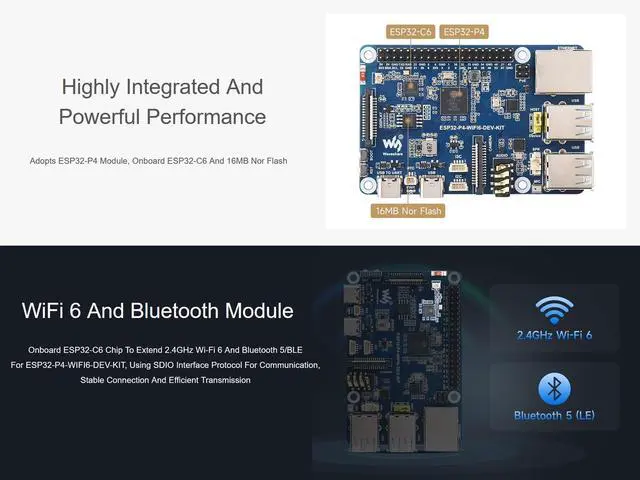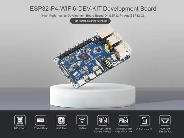OverviewThis product is a high-performance development board based on ESP32-P4 chip, with integrated RISC-V 32-bit dual-core and single-core processors. It features rich Human-Machine interfaces, including MIPI-CSI (with integrated Image Signal Processor), MIPI-DSI, SPI, I2S, I2C, LED PWM, MCPWM, RMT, ADC, UART, TWAI, etc. Additionally, it supports USB OTG 2.0 HS, Ethernet port and SDIO Host 3.0 for high-speed connectivity. The ESP32-P4 chip integrates the Digital Signature Peripheral and a dedicated Key Management Unit, ensuring secure data and operations. FeaturesHigh-performance MCU with RISC-V 32-bit dual-core and single-core processors128 KB HP ROM, 16 KB LP ROM, 768 KB HP L2MEM, 32 KB LP S-RAM, 8 KB TCM32MB PSRAM in the chip's package, with onboard 16MB Nor FlashPowerful image and voice processing capability.